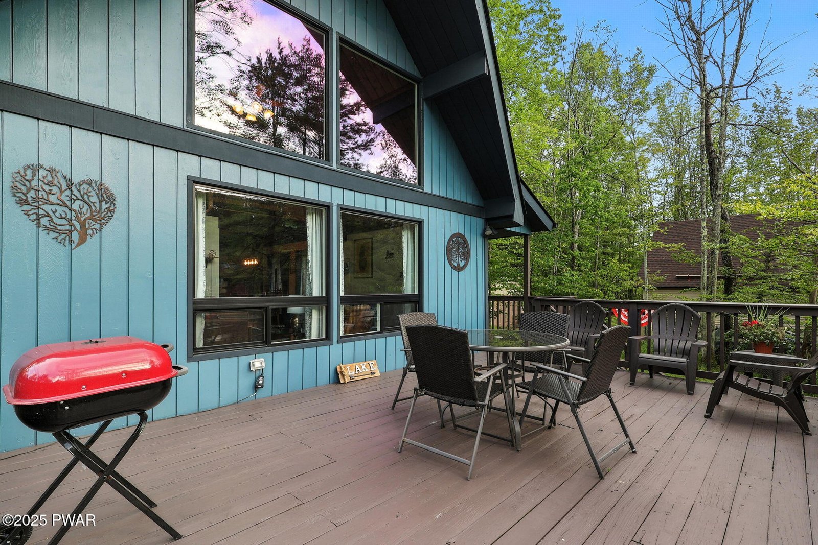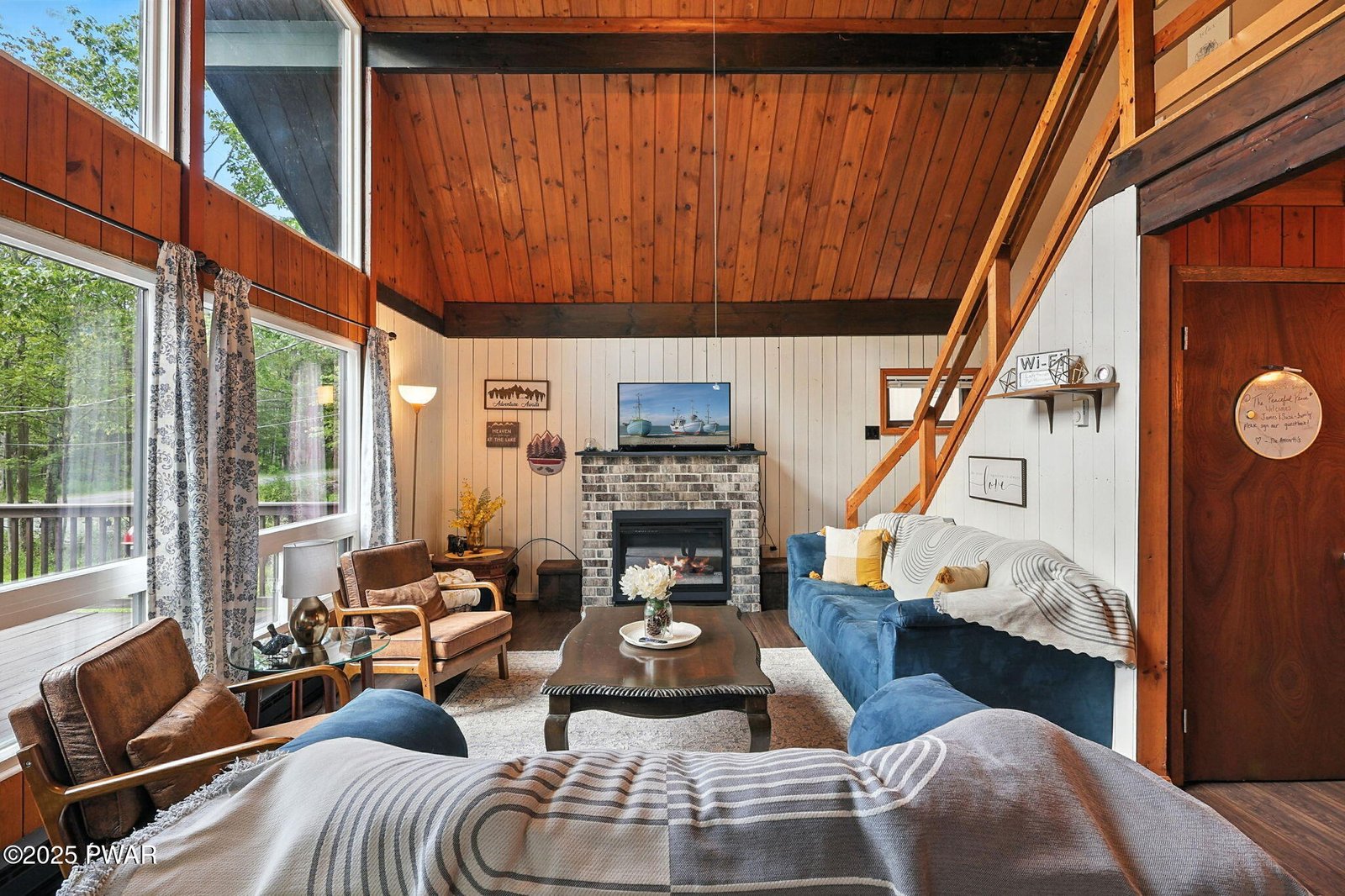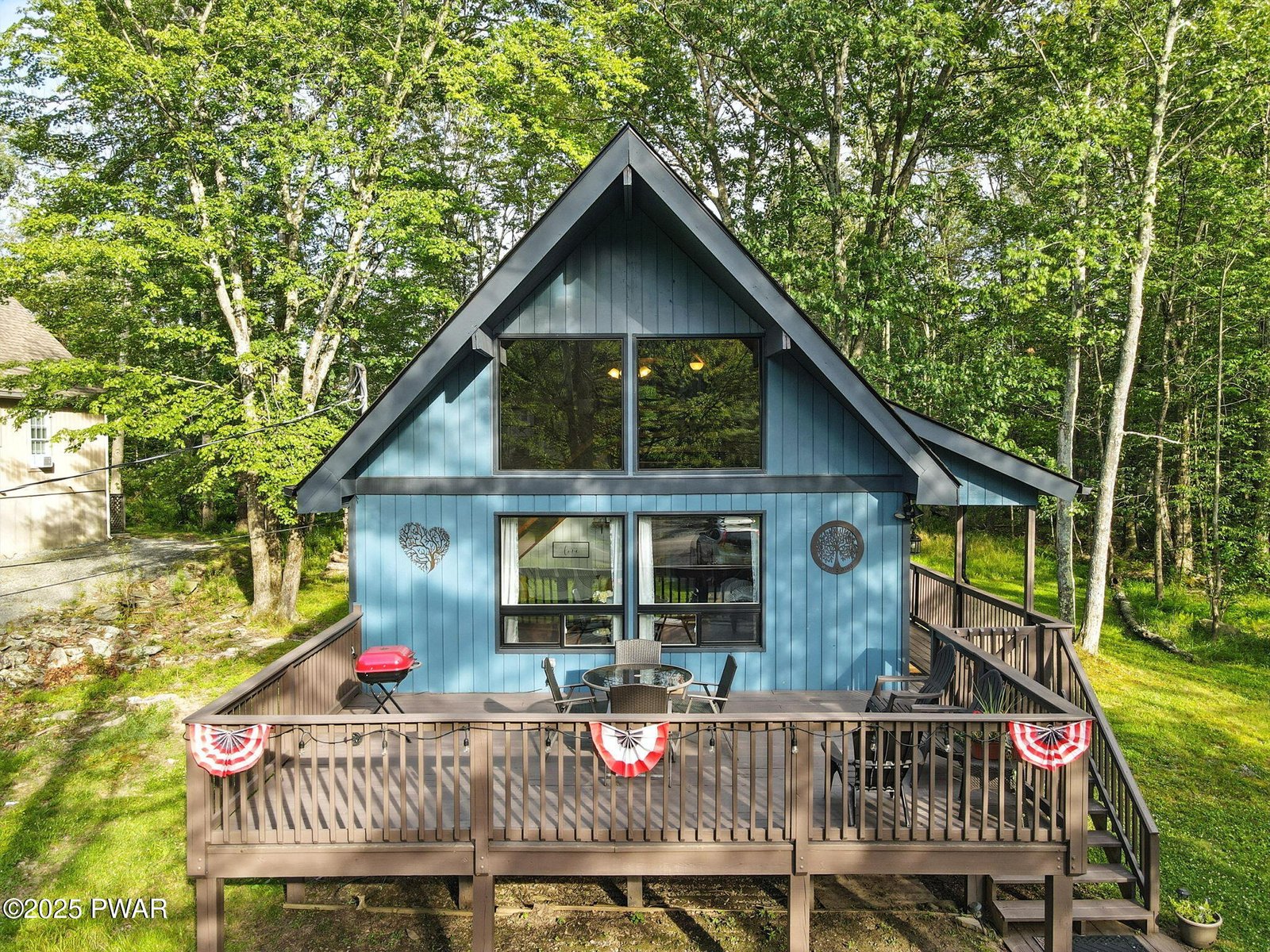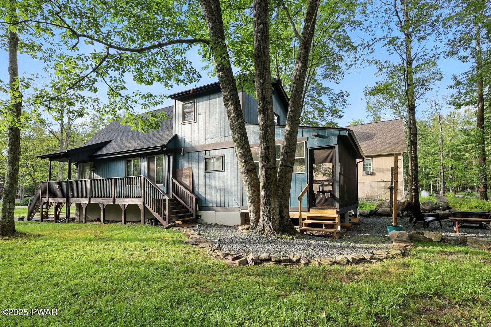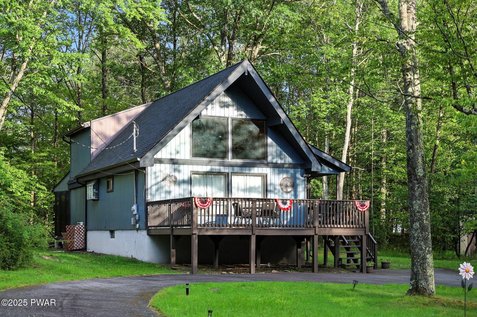 The Perfect Chalet in The Hideout!Discover this beautiful chalet home nestled in The Hideout, an amenity-filled, gated community in the Northern Poconos. This home is exactly what comes to mind when you picture the perfect chalet in the woods -- easy access with just a few steps to enter, a huge front deck for relaxing or entertaining, and a paved driveway for convenience.Step inside and be charmed by the soaring knotty pine ceilings, large windows that fill the home with natural sunlight, and a classic brick fireplace that adds the perfect touch of warmth and ambiance. The open floor plan offers great flow throughout, while many thoughtful updates preserve the authentic ski-chalet feel.The main-level primary bedroom features a full bathroom and direct access to the spacious screened-in porch overlooking a peaceful, low-maintenance backyard with a firepit and access to a scenic walking trail. Most major furnishings are included, making this an easy move-in or turnkey getaway!Located in the desirable north section of The Hideout, this home is just minutes from the golf course, clubhouse, and indoor recreation center -- the perfect retreat for year-round living or a weekend escape!