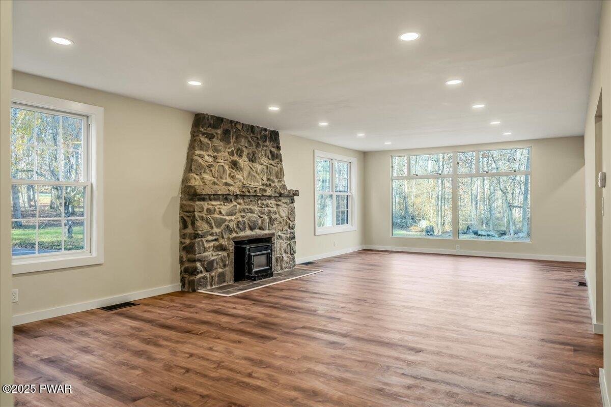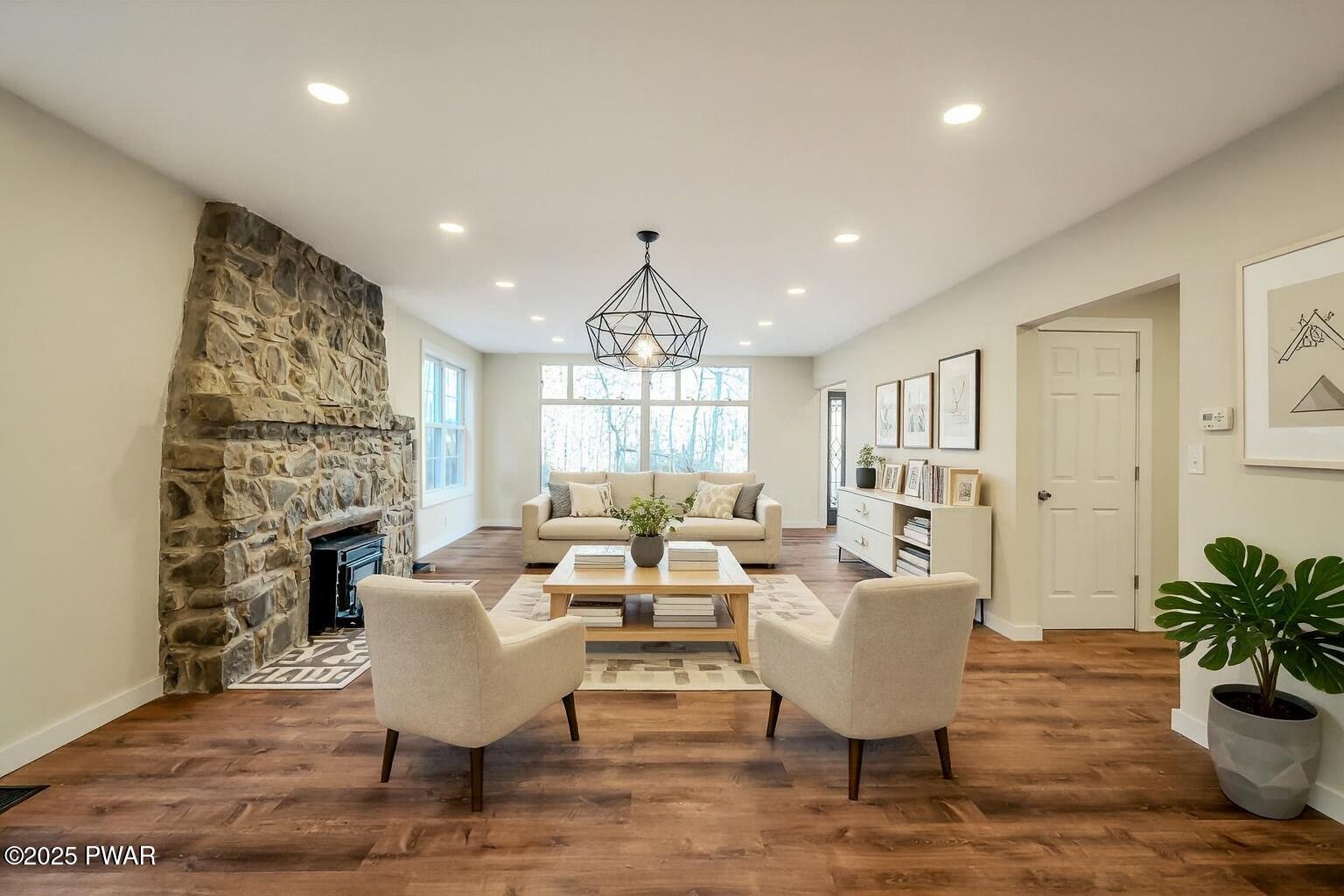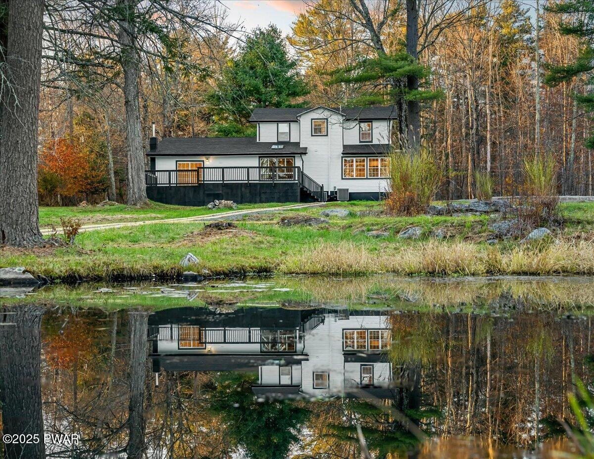 Do not wait to see this completely renovated short-term-rental-friendly stunner set on nearly two acres with two private ponds and unforgettable sunset views. This Clifton Township property is a standout opportunity for investors or anyone seeking a move-in-ready Pocono retreat. Every inch of this home has been reimagined with high-end finishes and modern upgrades, offering the perfect blend of style, comfort, and functionality. Inside, find luxury vinyl plank flooring throughout, a show-stopping stone fireplace in the living room, spacious dining room with wall-to-wall windows and family room with wood stove and sliding doors leading to the expansive back deck. The chef's kitchen boasts sleek gray cabinetry, a designer tile backsplash, stainless steel appliances, and a large island ideal for entertaining. The massive first-floor primary suite includes a custom walk-in closet system, while an additional first-floor flex room offers potential for a game room or extra sleeping space. Upstairs, four more bedrooms (including two with private en suite baths) provide the perfect setup for large groups or STR guests. Outside, a front porch, large back deck, and fire pit area overlooking the ponds make the most of the property's serene natural setting. Conveniently located just minutes from I-380, Gouldsboro State Park, and less than 30 minutes from Mount Airy Casino, Kalahari Resort, and The Crossings Premium Outlets, this home is a rare find. Homes this special don't last - schedule your private tour today!