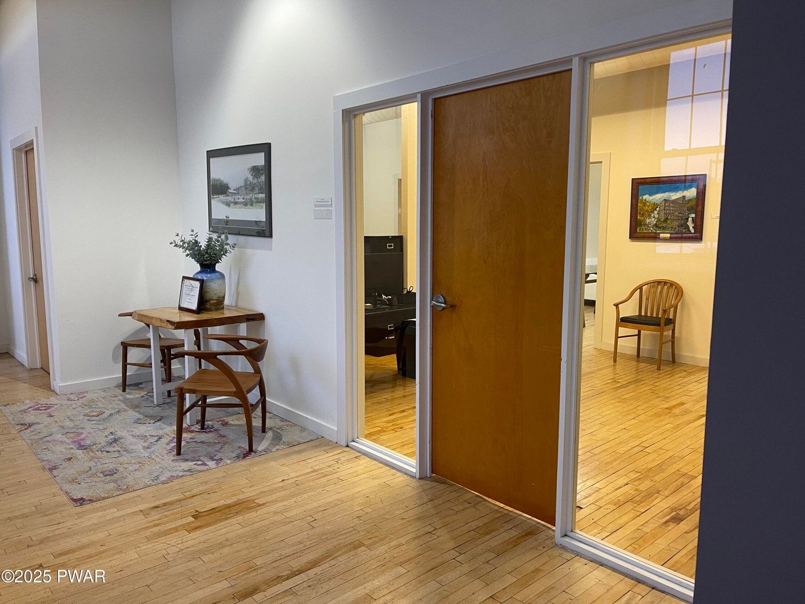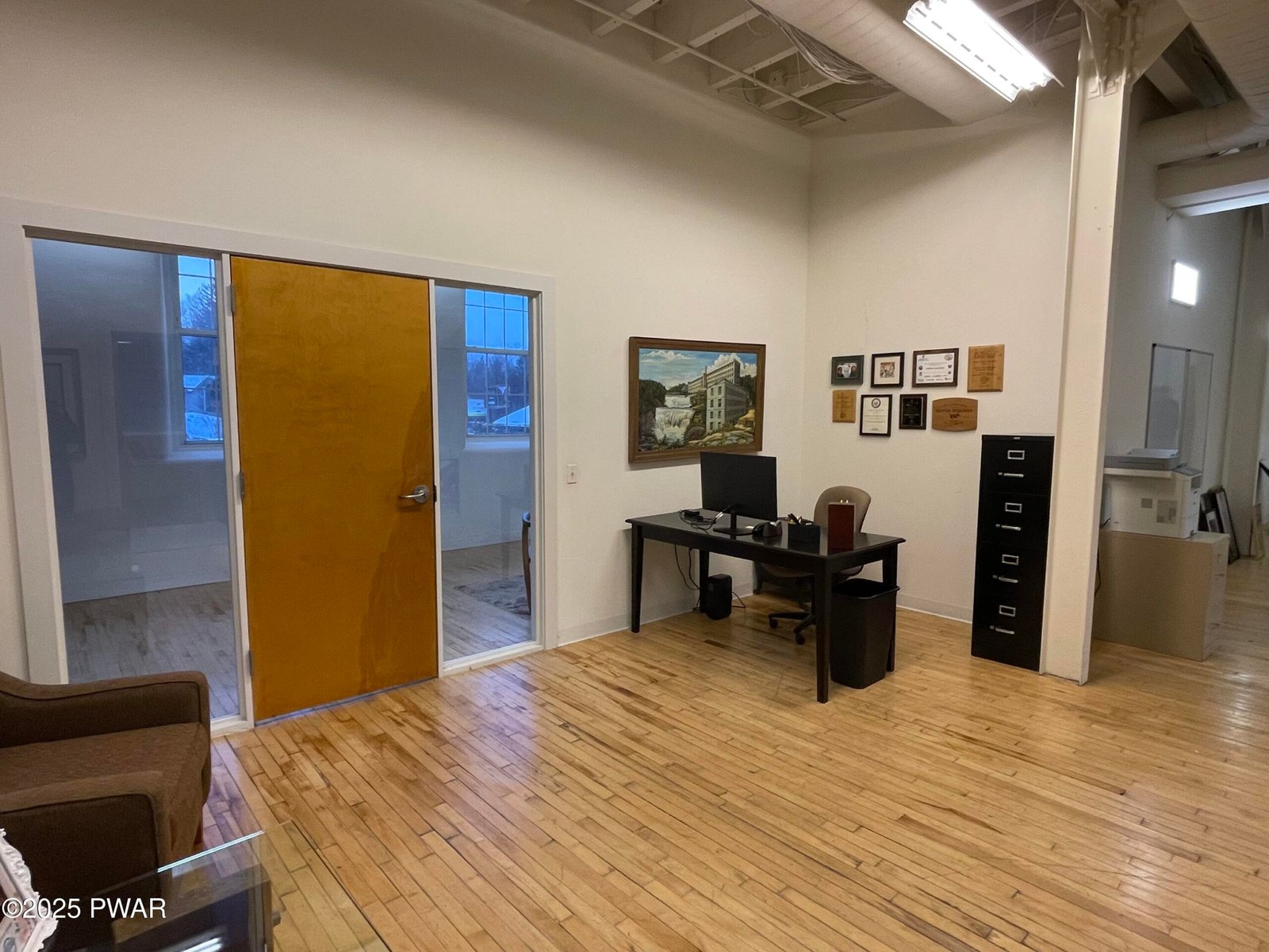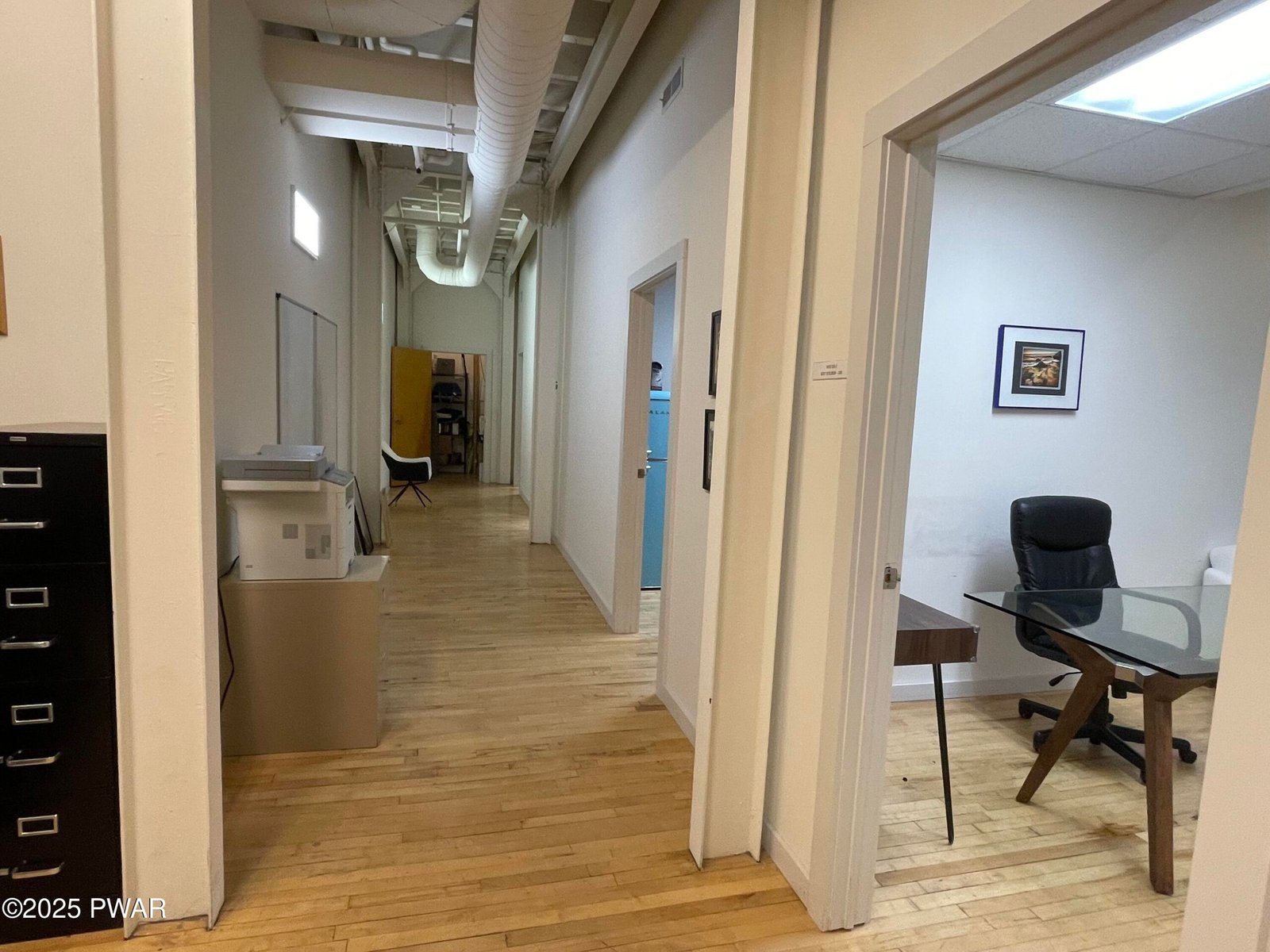 The Hawley Silk Mill is an iconic landmark in the heart of Hawley, offering a truly unique professional setting. This featured second-floor suite enjoys easy handicap accessibility and is filled with natural light, highlighted by beautiful hardwood floors throughout. The space includes a reception space and five private offices, making it ideal for a variety of professional uses. In addition to this suite, the Hawley Silk Mill offers multiple office suites of varying sizes and rental rates, with additional spaces becoming available from time to time--please call for current availability and details. Rent includes taxes, building insurance, electric, water, natural gas, sewer, and CAM services (trash, mail, and snow removal of common areas), providing exceptional value and convenience. The building features retail and fitness facilities on the main floor, a collection of professional offices on the second floor, and Lackawanna College occupying the third floor. Event spaces and food outlets further enhance the dynamic, mixed-use atmosphere found throughout the lower levels.